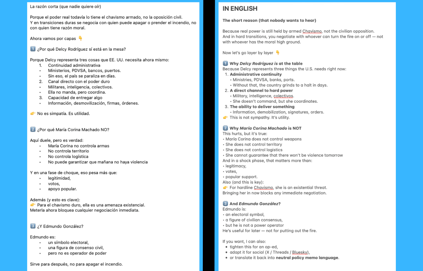 WhatsApp groups are sharing mental gymnastics about how Delcy, a staunch Chavez and Maduro loyalist, is a chess piece needed in Donald Trump's broader Venezuelan chess game to (eventually) install Venezuela's opposition as leaders.